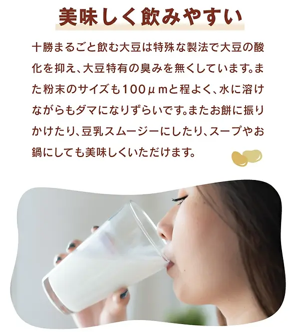 十勝まるごと飲む大豆は豆乳独特の青臭さとぬるぬる感がないので、 サラっとした飲みやすいスムージを作ることができます。